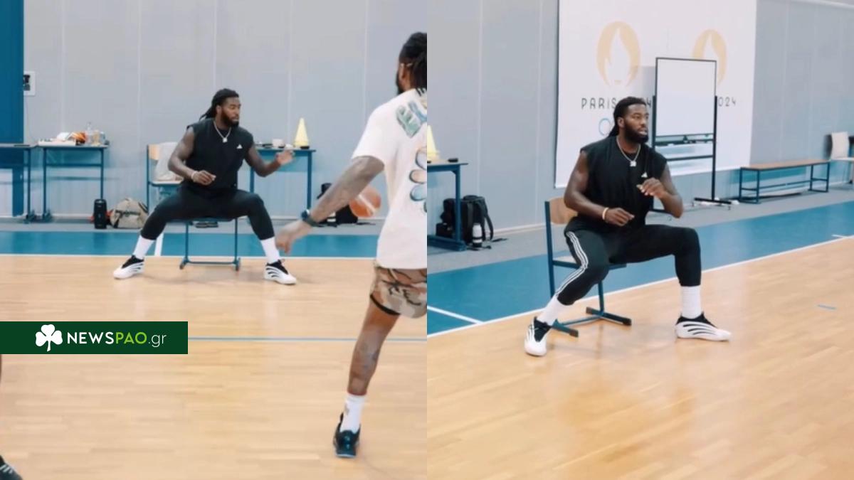 Σε ένα χαρακτηριστικό στιγμιότυπο από την προπόνησή του, φαίνεται να κάθεται σε καρέκλα και να δουλεύει λεπτομέρειες με προπονητές ατομικής βελτίωσης.