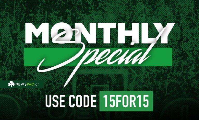 Η ΚΑΕ Παναθηναϊκός AKTOR προχώρησε σε μια νέα πρωτοβουλία για τους φίλους της ομάδας, λανσάροντας το πρόγραμμα Monthly Special. Από σήμερα και κάθε 15 του μήνα, οι φίλαθλοι θα έχουν τη δυνατότητα να προμηθεύονται εισιτήρια για όλους τους εντός έδρας αγώνες της EuroLeague με έκπτωση 15%.