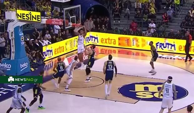 Ο αρχηγός του Παναθηναϊκού ύψωσε για τον Τούρκο σέντερ που κάρφωσε με μανία για δύο ακόμα πόντους των πρασίνων.