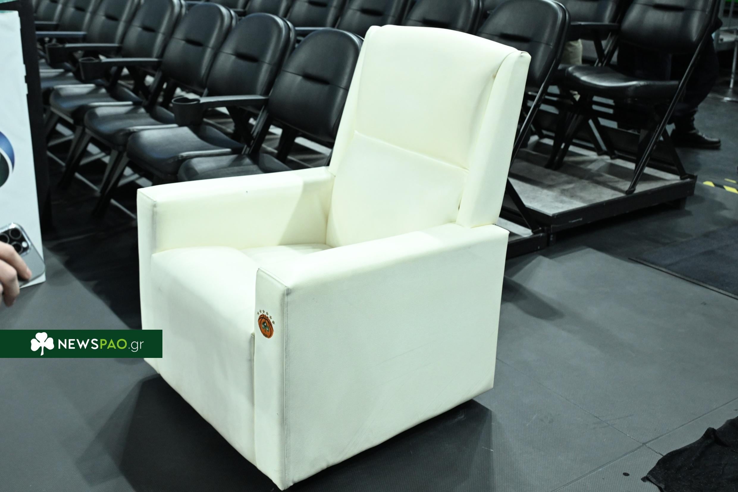 Περίπου τρεις ώρες πριν από την έναρξη της αναμέτρησης τοποθετήθηκε στο παρκέ η πολυθρόνα στην οποία κάθεται συνήθως ο ιδιοκτήτης της «πράσινης» ΚΑΕ.