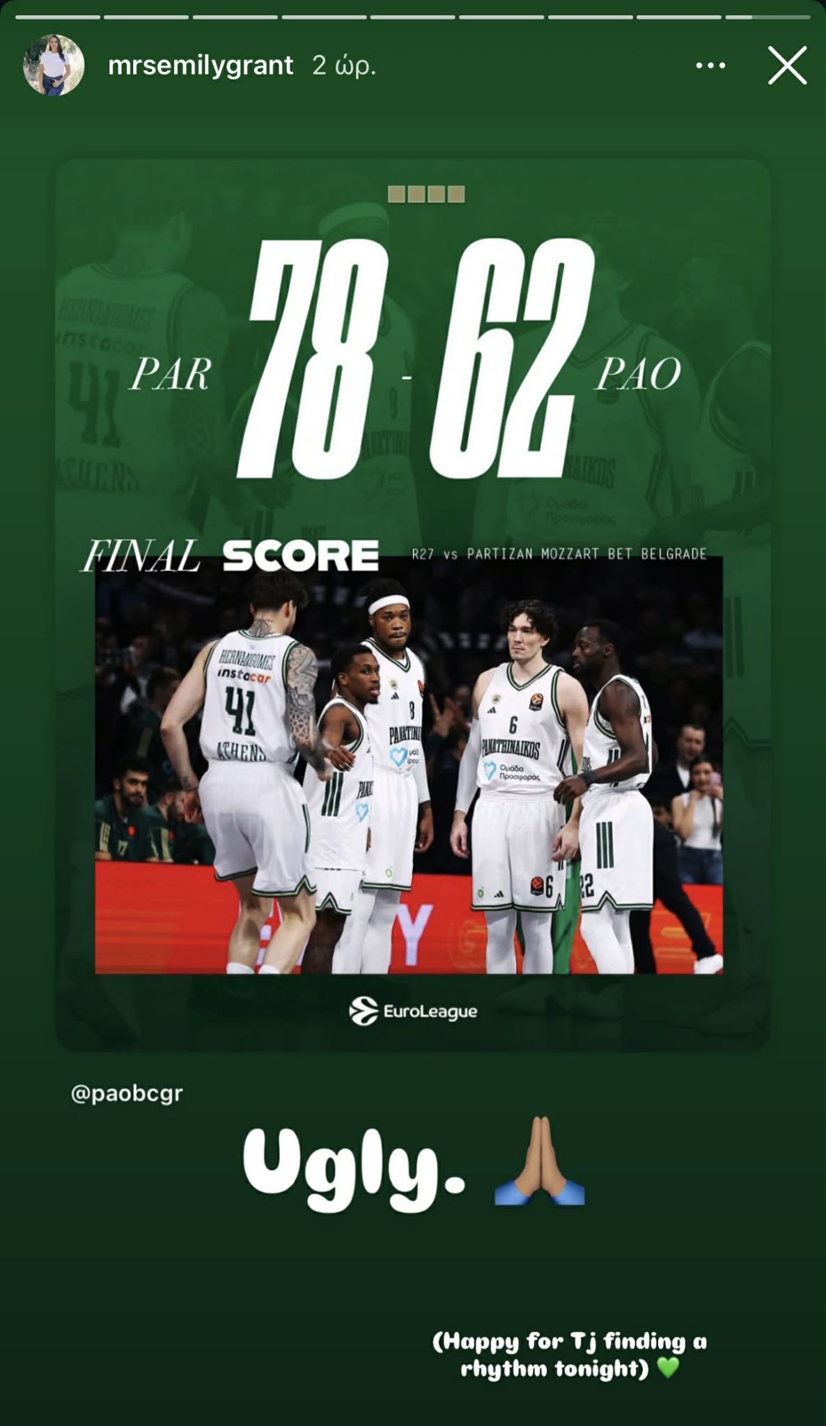 Η σύντροφος του Τζέριαν Γκραντ ξεχώρισε μια ευχάριστη είδηση για τον Παναθηναϊκό έπειτα από το άσχημο αποτέλεσμα στο Βελιγράδι κόντρα στην Παρτιζάν.