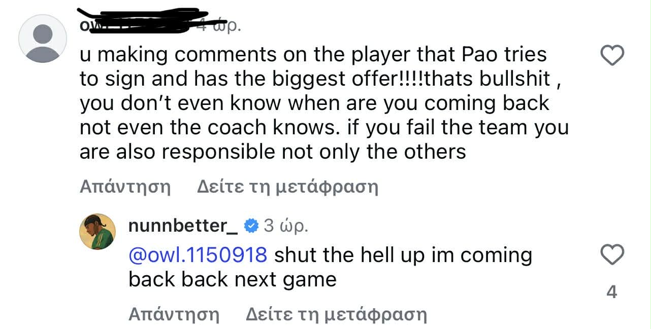 Ο Κέντρικ Ναν απάντησε σε οργισμένο φίλο του Παναθηναϊκού στα social media γνωστοποιώντας πως θα επιστρέψει στον επόμενο αγώνα της ομάδας κόντρα στη Φενερμπαχτσέ.