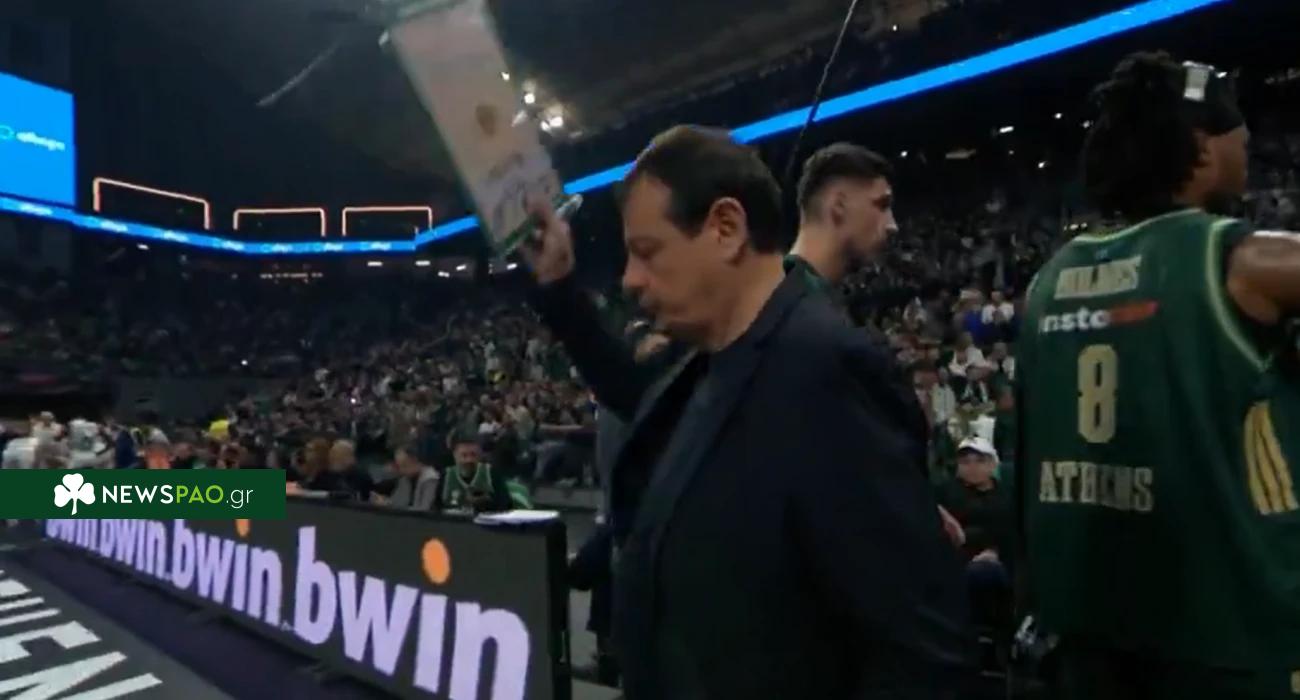 Σε ένα τάιμ άουτ κάλεσε όλους στον πάγκο και ξέσπασε, πετώντας με δύναμη το πινακάκι του στο glass floor του T-Center, σε μια κίνηση που αποτύπωσε την ένταση της στιγμής.