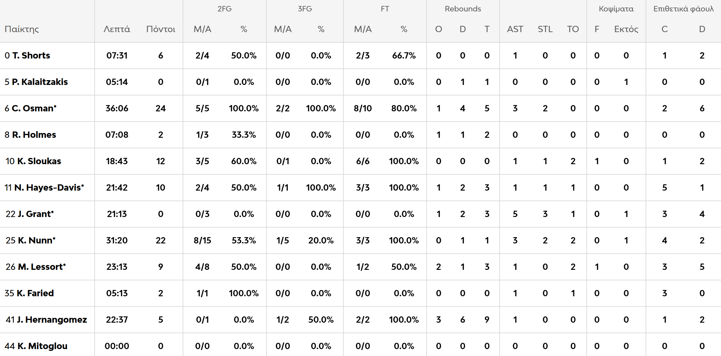 Ρισόν Χολμς (5/10): «Έπεσε» στα 7′ η συμμετοχή του και οφείλει να προσαρμοστεί πλέον στα νέα δεδομένα. Πέτυχε ένα καλάθι σε τρεις προσπάθειες.