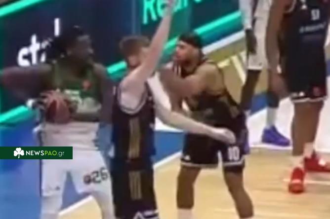 Ο φόργουορντ της Ντουμπάι BC σε μια φάση με τον πράσινο σέντερ ξεκίνησε τα mind-games πειράζοντας σε… νεκρό χρόνο τον αντίπαλό του που είχε γραπώσει τη μπάλα.