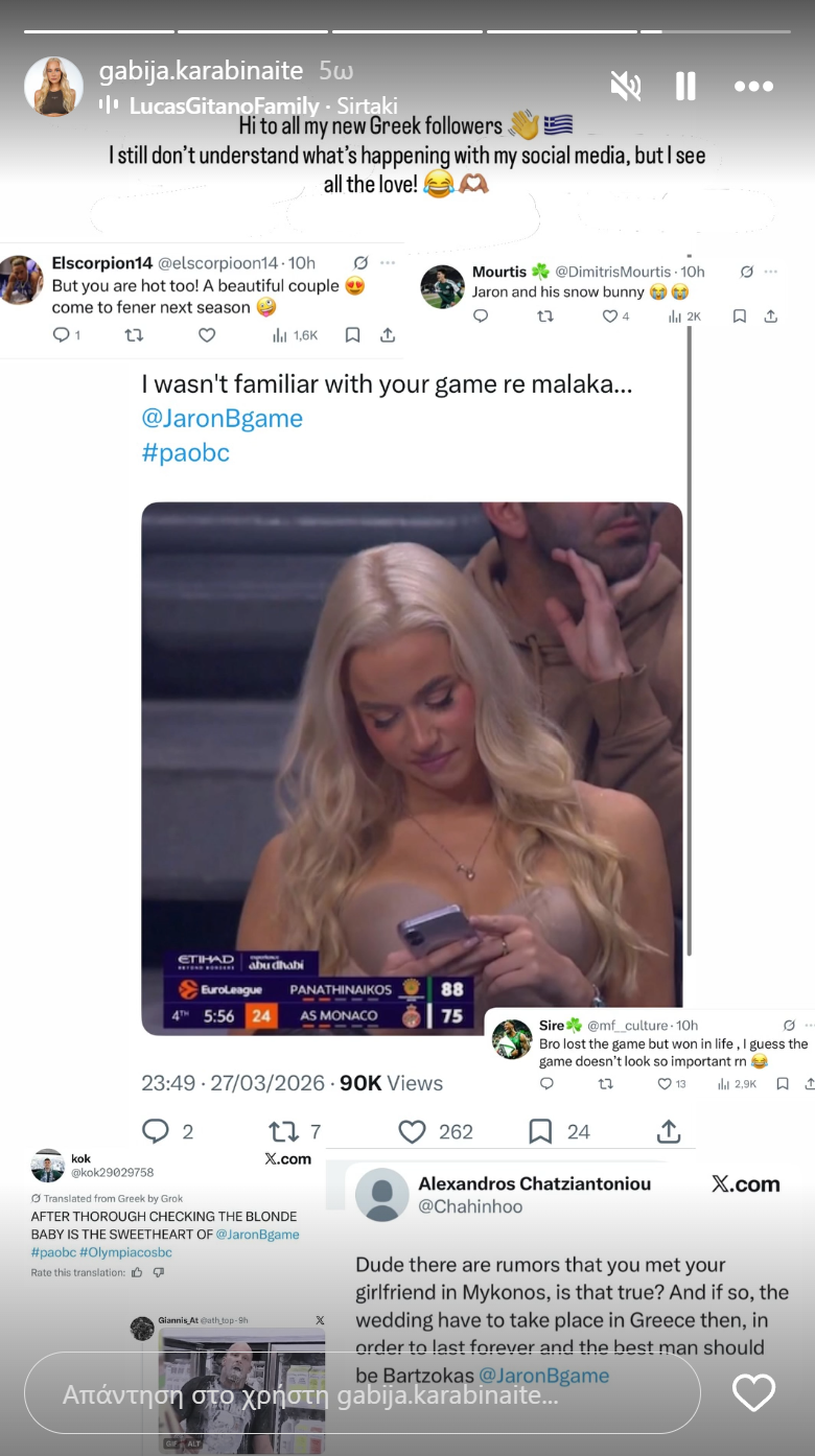 Μια μέρα μετά από το παιχνίδι η Γκαμπίγια Καραμπινάιτε, η σύντροφος του Τζάρον Μπλόσομγκεϊμ, αντέδρασε στα εκατοντάδες σχόλια που έλαβε από τους Έλληνες φιλάθλους.