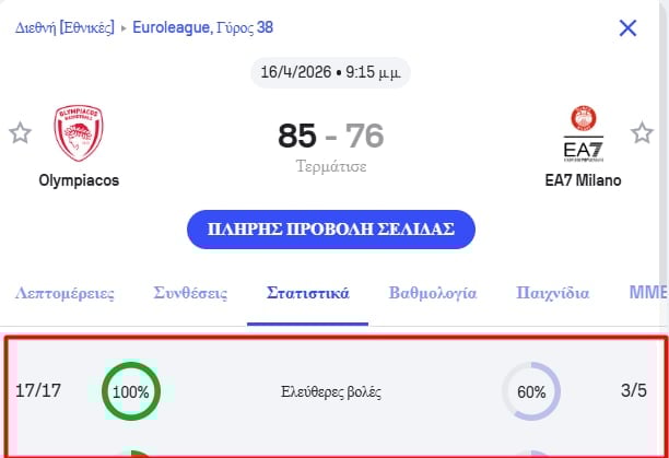 Ο Μεντί Ντιφαλά επιβράβευσε τον Ολυμπιακό με 17 ελεύθερες βολές έναντι μόλις 5 της Αρμάνι Μιλάνο.