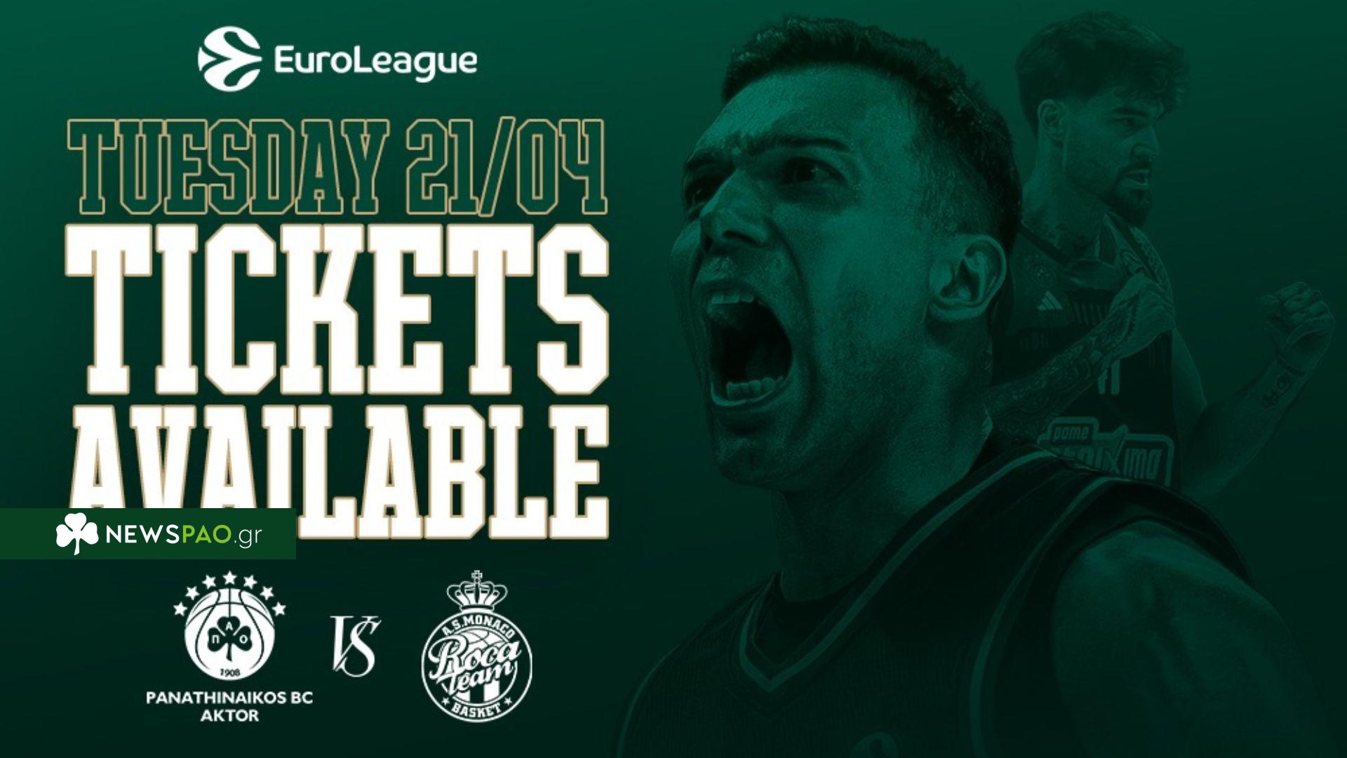 Η ΚΑΕ Παναθηναϊκός AKTOR ανακοίνωσε την έναρξη διάθεσης των εισιτηρίων για την εντός έδρας αναμέτρηση με την AS Monaco, η οποία θα διεξαχθεί την Τρίτη 21 Απριλίου στις 21:00 για τα play-in της EuroLeague.