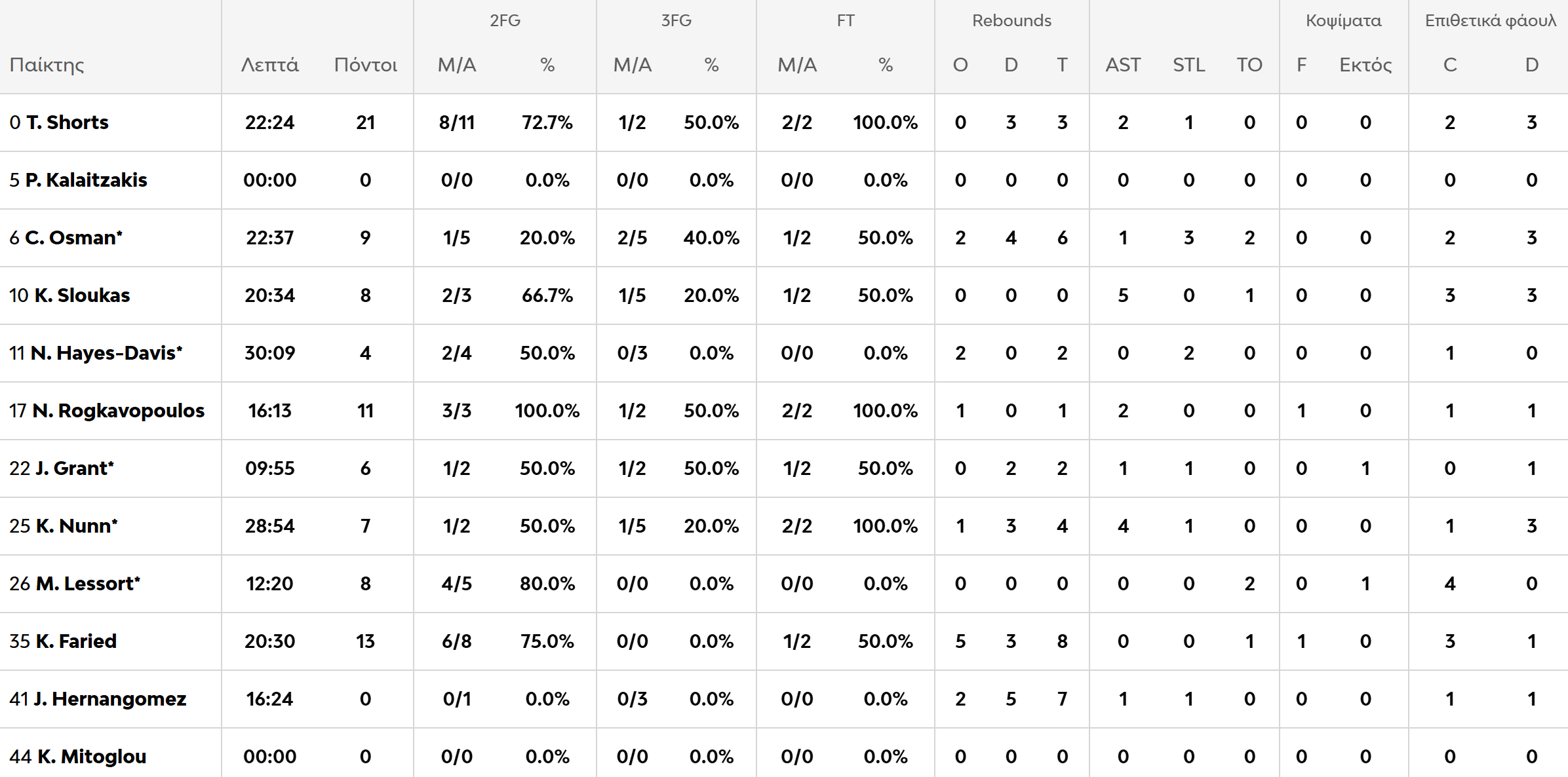 Κώστας Σλούκας (7/10): Θετική εμφάνιση από τον αρχηγό με 8 πόντους και 5 ασίστ. Μοιράστηκε τον χρόνο με τον Σορτς.