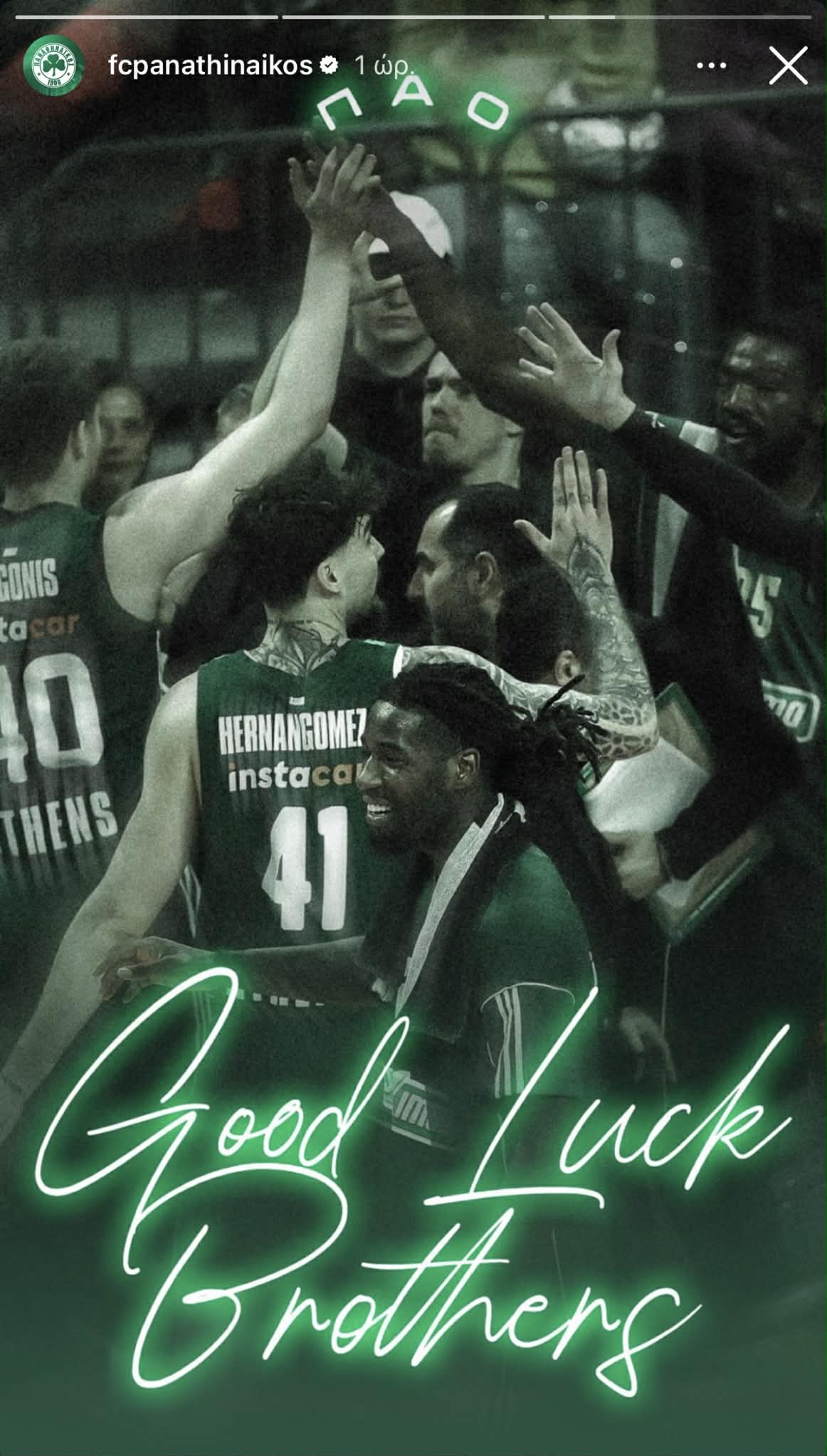 «Καλή τύχη αδέρφια», το μήνυμα της ΠΑΕ προς τη μπασκετική ομάδα των πρασίνων.