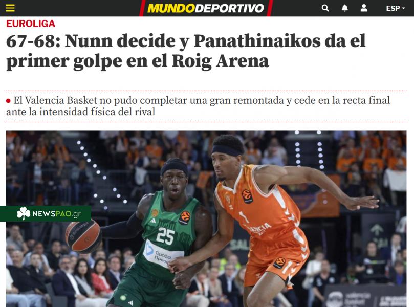 Η Mundo Deportivo έβαλε στο επίκεντρο της ανάλυσής της τον Αμερικανό γκαρντ, αποτυπώνοντας με ξεκάθαρο τρόπο το πώς είδαν οι Ισπανοί το φινάλε του αγώνα. «Ο Ναν αποφασίζει και ο Παναθηναϊκός χτυπάει πρώτος στην Roig Arena», ήταν ο χαρακτηριστικός τίτλος, με το βάρος να πέφτει και στο πολύ δυνατό πρώτο ημίχρονο του «τριφυλλιού».
