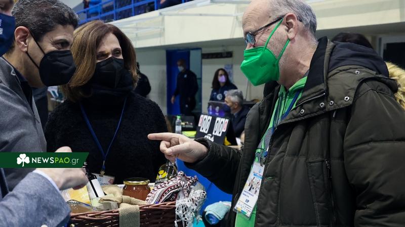 Φημισμένοι για τη φιλοξενία τους οι Κρητικοί έδωσαν στον πρόεδρο του Ερασιτέχνη Παναθηναϊκού ένα καλάθι με ρακές, μέλι, τυρί και κρασί.