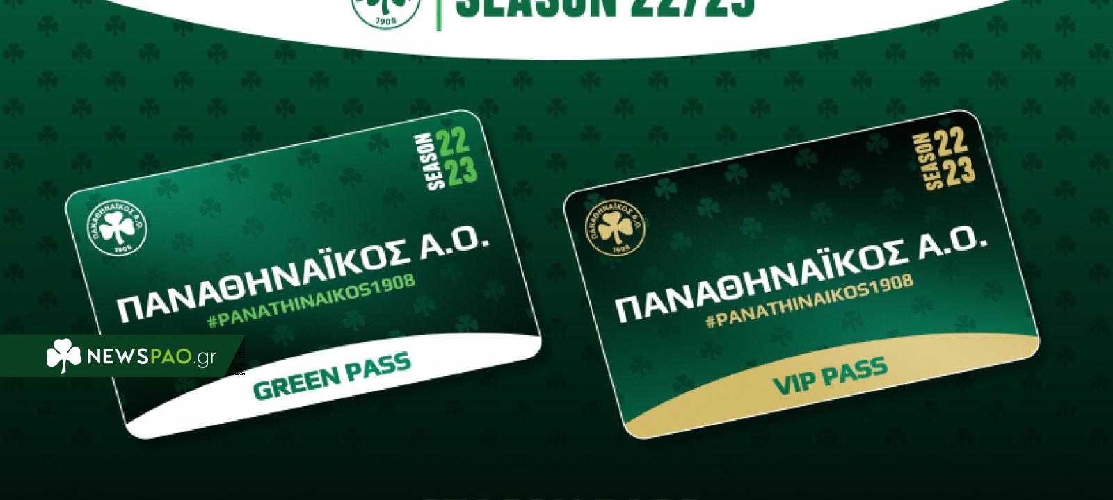 Ο Παναθηναϊκός Αθλητικός Όμιλος ανακοινώνει ότι ξεκίνησε η διάθεση των καρτών διαρκείας για την αγωνιστική περίοδο 2022-2023 με την ονομασία Green Pass και VIP Pass.