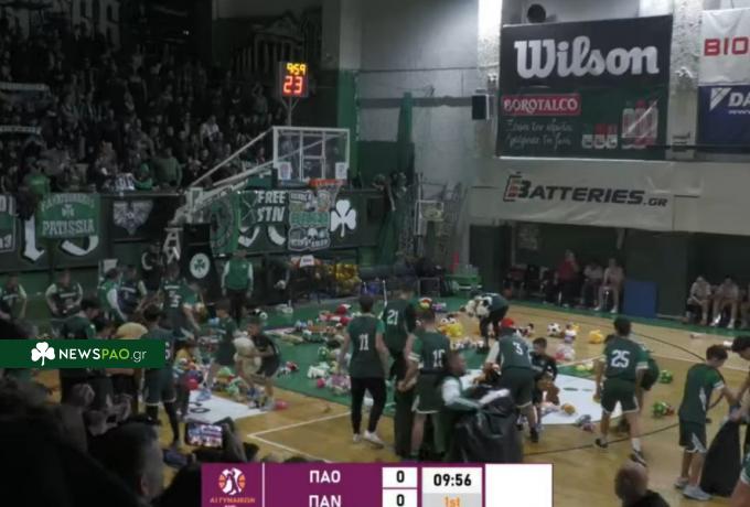 Συγκεκριμένα με το που έγινε το τζάμπολ του αγώνα, το παρκέ του «Παύλος Γιαννακόπουλος» γέμισε με λούτρινα κουκλάκια που πέταξαν οι φίλαθλοι της ομάδας που βρίσκονται στο γήπεδο, για να την υποστηρίξουν σ’ αυτή την αναμέτρηση.