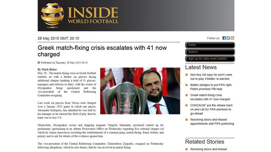 Το θέμα της εγκληματικής οργάνωσης στον χώρο του ελληνικού ποδοσφαίρου κάνει εδώ και καιρό το γύρο του κόσμου. Οι τελευταίες εξελίξεις στη FIFA, δεν αποκλείεται μάλιστα να επισπεύσουν τις εγχώριες διαδικασίες και να αρχίσει σιγά σιγά να ξεκαθαρίζει το τοπίο σχετικά με τους κατηγορούμενους αλλά και τις ομάδες που εμπλέκονται στην υπόθεση. Το παραπάνω, είναι ουσιαστικά αυτό που υποστηρίζει στον επίλογο του θέματός της και η έγκυρη διεθνής ιστοσελίδα insideworldfootball.com, η οποία ασχολείται με όσα απασχολούν το ευρωπαϊκό και παγκόσμιο ποδόσφαιρο. Ο τίτλος του θέματος: «Στους 41 οι κατηγορούμενοι για το ελληνικό σκάνδαλο στημένων αγώνων».