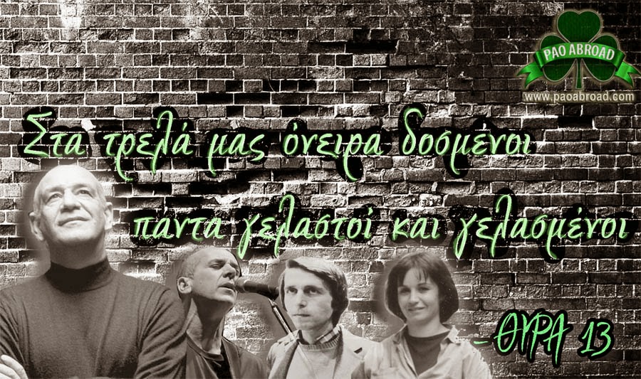 «Και ως ότι αφορά το άλλο δίστιχο “Στα τρελά τους όνειρα δοσμένοι πάντα γελαστοί και γελασμένοι”, μου είπε ο Αλκαίος που μένει κοντά στη Λεωφόρο Αλεξάνδρας πως μετά τις δύο διαδοχικές ήττες -τώρα γίνανε και τρεις- του Παναθηναϊκού στην έδρα του είδε το εξής περνώντας από διανοούμενο της Θύρας 13 υποθέτω, απευθυνόμενος στον Βαρδινογιάννη έγραφε: “Στα τρελά μας όνειρα δοσμένοι πάντα γελαστοί και γελασμένοι – Θύρα 13”».