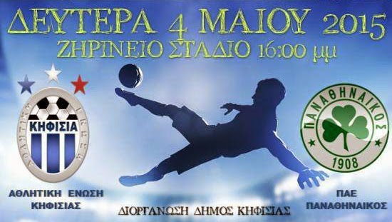 «Ποδοσφαιρικός αγώνας μεταξύ της Αθλητικής Ένωσης Κηφισιάς και της ΠΑΕ Παναθηναικός θα διεξαχθεί την Δευτέρα 4 Μαίου και ώρα 16:00 μμ στο Ζηρίνειο Στάδιο της Κηφισιάς.