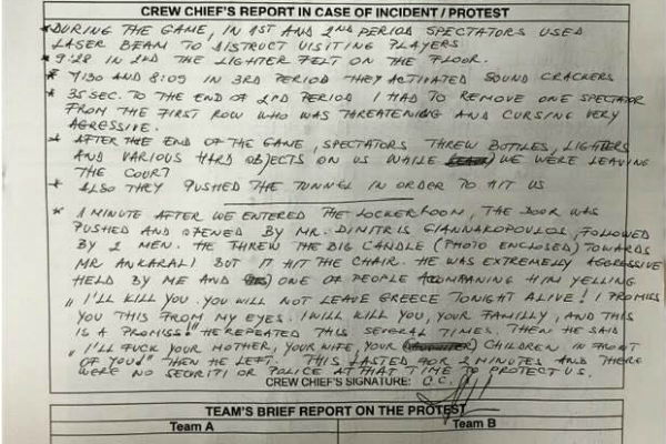 «Ένα λεπτό αφότου μπήκαμε στα αποδυτήρια, η πόρτα άνοιξε από τον Δημήτρη Γιαννακόπουλο, τον οποίο ακολουθούσε ένας άνδρας. Πέταξε το μεγάλο κερί (επισυνάπτεται φωτογραφία) προς τον κύριο Ανκαραλί, αλλά χτύπησε την καρέκλα. Ήταν εξαιρετικά επιθετικός και ενώ συγκρατείτο από μένα και έναν από τους ανθρώπους που τον συνόδευαν, φώναζε: “Θα σε σκοτώσω, δεν θα φύγεις ζωντανός από την Ελλάδα απόψε. Στο ορκίζομαι στα μάτια μου! Θα σκοτώσω εσένα, την οικογένειά σου και αυτό είναι υπόσχεση”. Το επανέλαβε αυτό αρκετές φορές. Μετά είπε: “Θα γ…ω, τη μάνα σου, τη γυναίκα σου και τα παιδιά σου, μπροστά σου”. Μετά έφυγε. Αυτό διήρκεσε για δύο λεπτά και δεν υπήρχε ούτε ασφάλεια, ούτε αστυνομία εκείνη την ώρα για να μας προστατέψει».