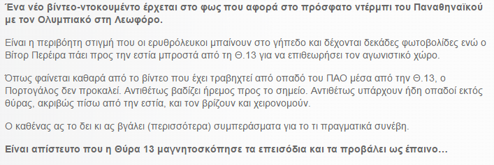 Δείτε συγκεκριμένα, μερικά άρθρα από αντικειμενικούς και μη για το βίντεο από τον επίσημο λογαριασμό της Θύρας 13 το οποίο ΔΕΝ ΔΕΙΧΝΕΙ τίποτα από τα πραγματικά γεγονότα του ντέρμπι.