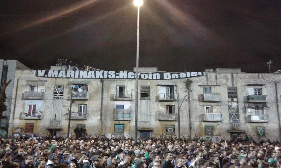 Το συγκεκριμένο πανό που υψώθηκε και στο πρόσφατο παιχνίδι του Εξάστερου με την Μπαρτσελόνα στο ΟΑΚΑ αναφέρει: V.MARINAKIS: HEROIN DEALER.