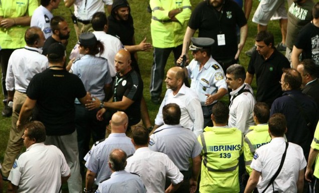 Οι φίλοι των «πρασίνων» δεν έμειναν στα συνθήματα κατά του Μισέλ Πλατινί και τα πανό που συνέδεαν τον Γάλλο πρόεδρο με τον Ολυμπιακό, αλλά ήρθε το… ντου στο τέλος του αγώνα, με προπηλακισμούς παικτών για να ολοκληρώσει το καταστροφικό βράδυ για το Τριφύλλι.