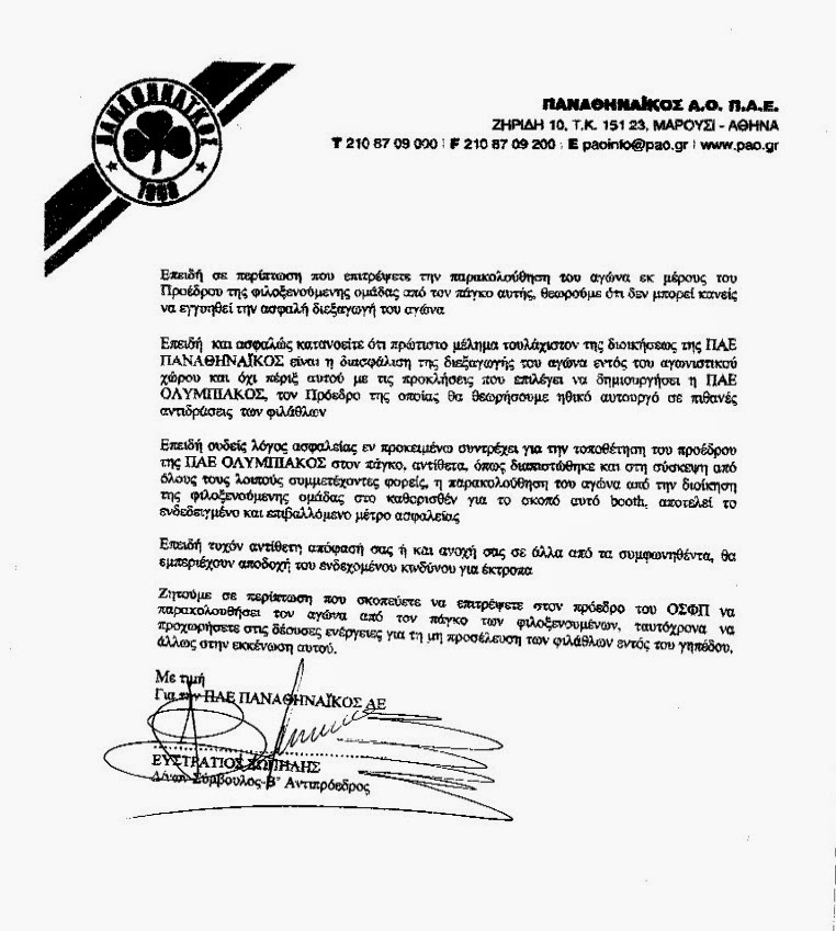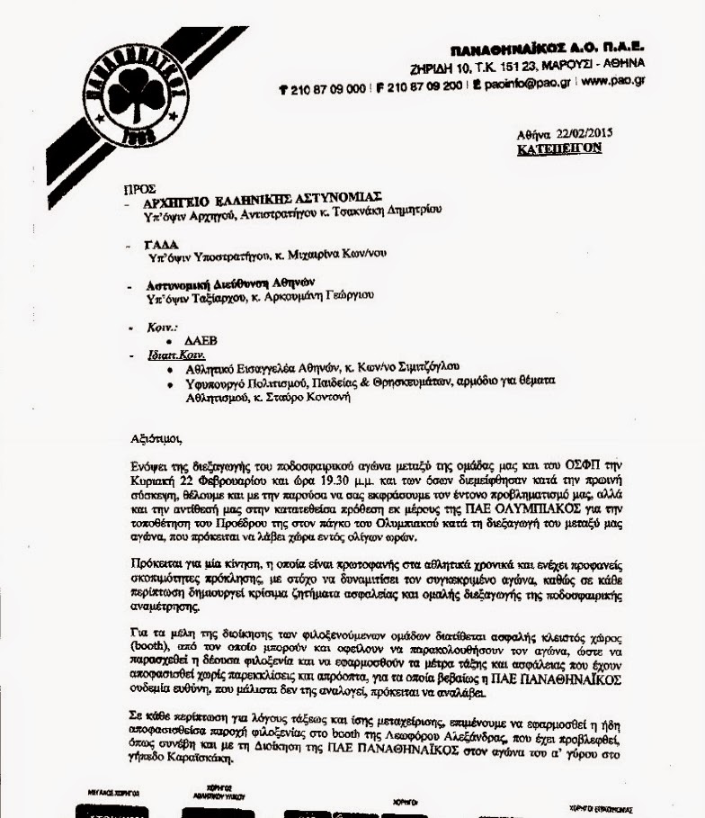 Ο κ. Αλαφούζος μάλιστα, ενημέρωσε ότι είχε επικοινωνίσει προσωπικά με τον Εισαγγελέα αλλά και τον κ. Κοντονή, ένω η ΠΑΕ είχε στείλει στο Αρχηγείο της Ελληνικής Αστυνομίας, στη ΓΑΔΑ, στην Αστυνομική Διεύθυνση Αθηνών και ιδιαίτερη κοινοποίηση στον Αθλητικό Εισαγγελέα Αθηνών, Κων/νο Σιμιτζόγλου και τον Υφυπουργό, Σταύρο Κοντονή, την παρακάτω επιστολή στην οποία γίνεται λόγος για «πρωτοφανή στα αθλητικά χρονικά κίνηση που ενέχει προφανείς σκοπιμότητες πρόκλησης».