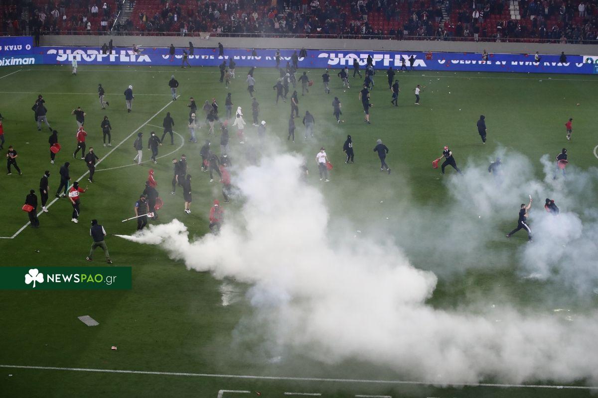 Μετά το τελευταίο σφύριγμα του διαιτητή στο ντέρμπι του Ολυμπιακού με την ΑΕΚ (1-3) ακολούθησε εισβολή οπαδών των ερυθρόλευκων στον αγωνιστικό χώρο του Γεώργιος Καραϊσκάκης, με τα ΜΑΤ να προχωρούν σε εκτεταμένη χρήση δακρυγόνων.