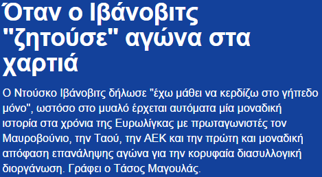 Όταν ο Ιβάνοβιτς “ζητούσε” αγώνα στα χαρτιά, στο οποίο αναφέρει “Ο Ντούσκο Ιβάνοβιτς δήλωσε “έχω μάθει να κερδίζω στο γήπεδο μόνο”, ωστόσο στο μυαλό έρχεται αυτόματα μία μοναδική ιστορία στα χρόνια της Ευρωλίγκας με πρωταγωνιστές τον Μαυροβούνιο, την Ταού, την ΑΕΚ και την πρώτη και μοναδική απόφαση επανάληψης αγώνα για την κορυφαία διασυλλογική διοργάνωση”.