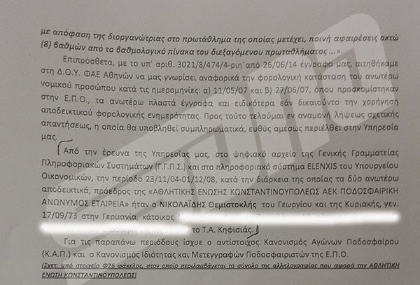 Το εισαγγελικό πόρισμα, όπως μπορείτε να διαπιστώσετε, δεν αφήνει περιθώρια για παρερμηνείες. Αναφέρεται σε δύο ξεχωριστές περιπτώσεις πλαστών εγγράφων (και τα δύο αποδεικτικά ενημερότητας για χρέη προς το Δημόσιο με ημερομηνίες… έκδοσης 21/6/07 και 30/4/07), με το πόρισμα να αναφέρει στο τέλος της αναφοράς του για την ΑΕΚ πως πρόεδρος της εταιρίας εκείνη την περίοδο ήταν ο Ντέμης Νικολαϊδης.