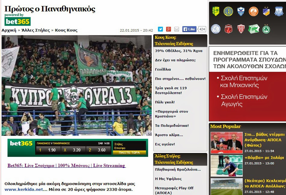Η λατρεία για τον Παναθηναϊκό στην Κύπρο είναι γνωστή κι εκδηλώνεται σε κάθε επίσκεψη του εκεί. Μια δημοσκόπηση απ’ τη Μεγαλόνησο ωστόσο ήρθε να επιβεβαιώσει πανηγυρικά το γεγονός ότι το «τριφύλλι» αποτελεί την πρώτη επιλογή των Κύπριων όσο αναφορά στις ελληνικές ή πιο σωστά ελλαδικές ομάδες. Συγκεκριμένα, μεγάλο γκάλοπ της έγκυρης ιστοσελίδας kerkida.net έφερε τον Παναθηναϊκό πρώτο και μάλιστα με μεγάλη διαφορά στις προτίμησες των Κυπριών φιλάθλων.