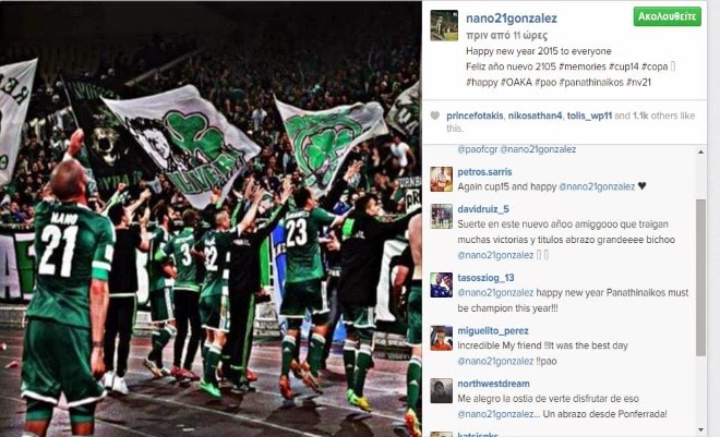 Ο αριστερός μπακ του “τριφυλλιού” ανέβασε στον προσωπικό του λογαριασμό, μια φωτογραφία με τους πανηγυρισμούς των ποδοσφαιριστών, από την περσινή τεσσάρα στον τελικό του Κυπέλλου με τον ΠΑΟΚ, στο ΟΑΚΑ, και από κάτω ευχήθηκε για τον καινούριο χρόνο, τόσο στα Αγγλικά όσο και στα Ισπανικά…