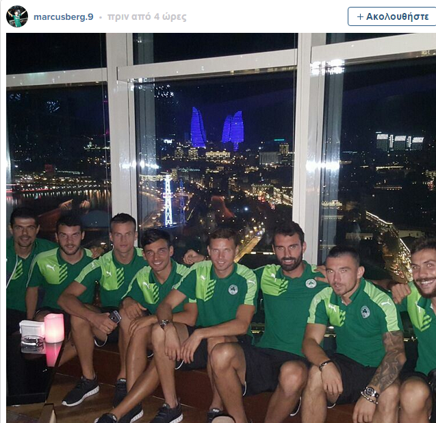 Ο Μάρκους Μπεργκ ανέβασε μία φωτογραφία στον προσωπικό του λογαριασμό στο instagram με συμπαίκτες του στον Παναθηναϊκό και φόντο το νυχτερινό Μπακού.