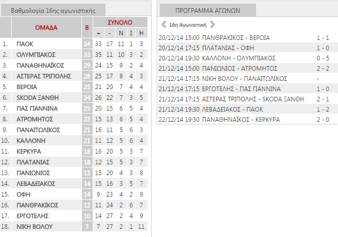 Δείτε πως διαμορφώθηκε η βαθμολογία της Σούπερ Λιγκ μετά την 16η αγωνιστική…
