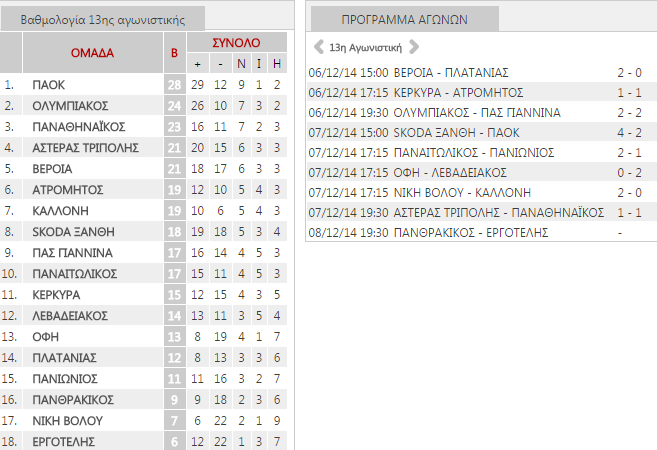 Δείτε πως διαμορφώθηκε η βαθμολογία μετά τη 13 αγωνιστικά…