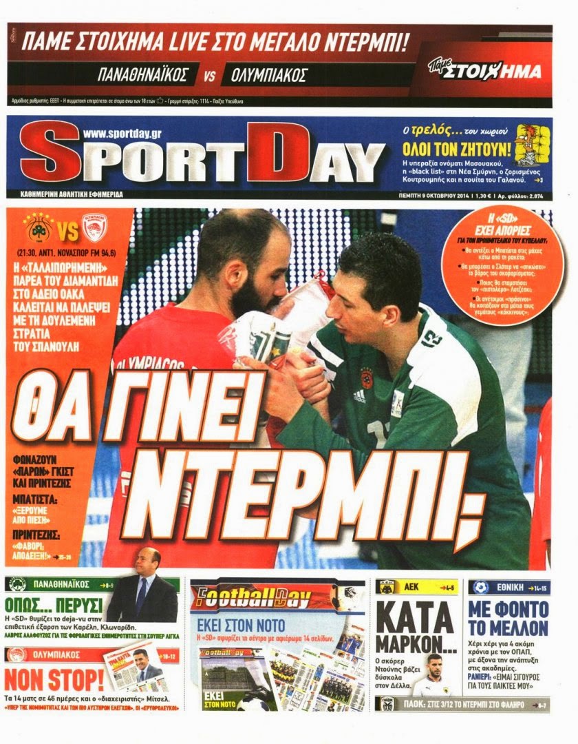 Γιατί όταν ο πρωτοσέλιδος τίτλος είναι “Θα γίνει ντέρμπι;” και το δεύτερο ερώτημα είναι αν μπορεί “Η… ταλαιπωρημένη παρέα του Διαμαντίδη να παλέψει στο άδειο ΟΑΚΑ με τη δουλεμένη στρατία του Σπανούλη”, κάπου είναι τραβηγμένο…