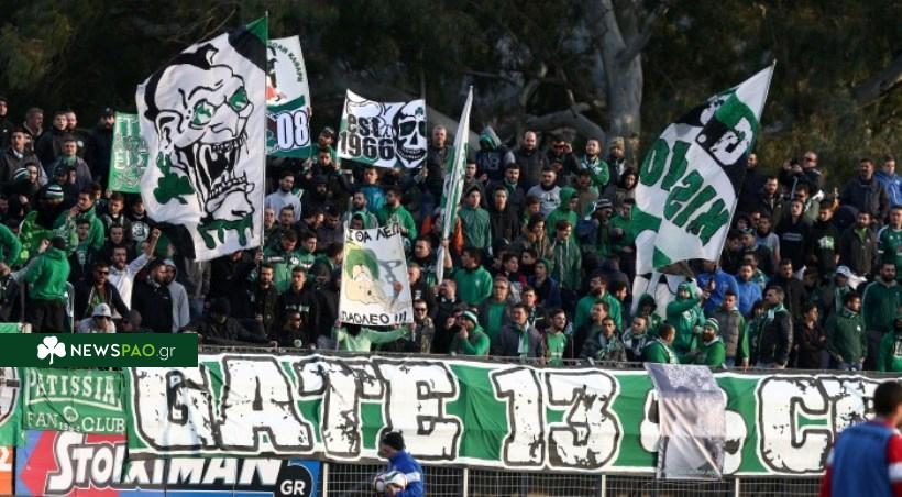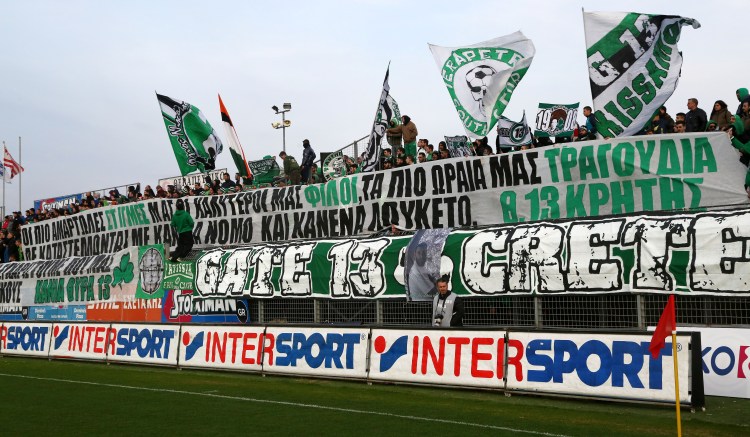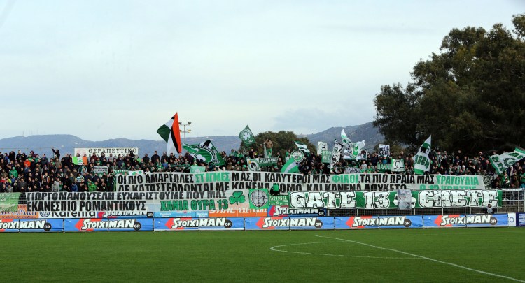 Περισσότεροι από 500 φίλοι του «τριφυλλιού» από την Κρήτη βρέθηκαν στα Περιβόλια και «σήκωσαν» ένα πανό τεράστιων διαστάσεων θέλοντας να στείλουν το μήνυμά τους στον Υφυπουργό Αθλητισμού Σταύρο Κοντονή, ο οποίος αποφάσισε το «λουκέτο» στις θύρες 13-14.