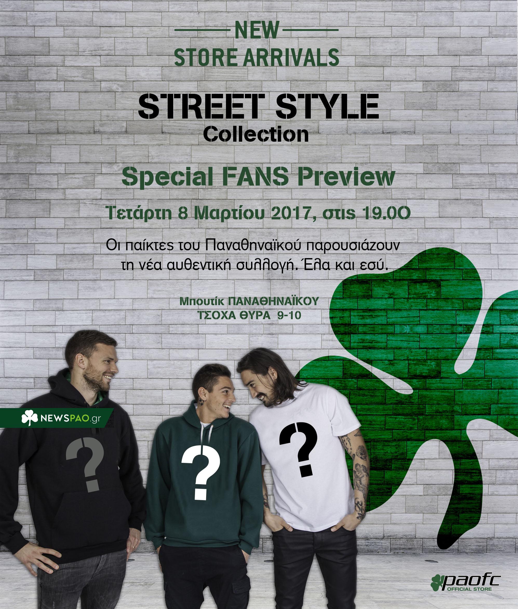 Η νέα «STREET STYLE Collection», με πολλά νέα σχέδια και προσιτές τιμές, θα είναι διαθέσιμη προς πώληση τόσο στις μπουτίκ του ΠΑΝΑΘΗΝΑΪΚΟΥ όσο και στο νέο, ανανεωμένο, ηλεκτρονικό κατάστημα www.paofc.gr