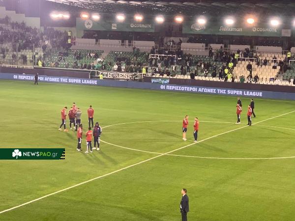 Οι παίκτες του Ολυμπιακού βγήκαν για την καθιερωμένη αγωνιστική βόλτα τους λίγο πριν τη μεγάλη σέντρα και όπως είναι λογικό αποδοκιμάστηκαν έντονα από τους οπαδούς του Τριφυλλιού.