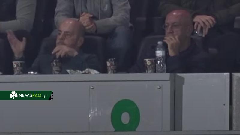 Από το πλάνο που δίνεται μέσω της κάμερας των «πρασίνων», ο Γιάννης Αλαφούζος φαίνεται να κάνει το δικό του σχόλιο για το ματς, κουνώντας ενδεικτικά το χέρι του.