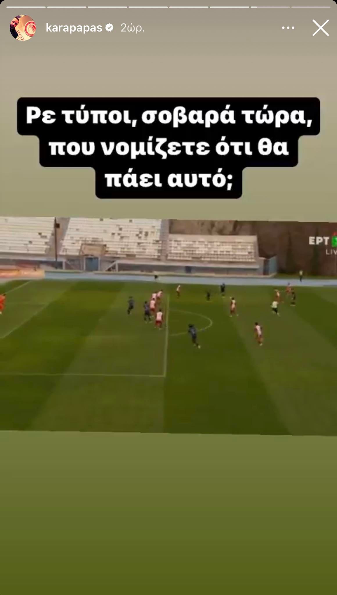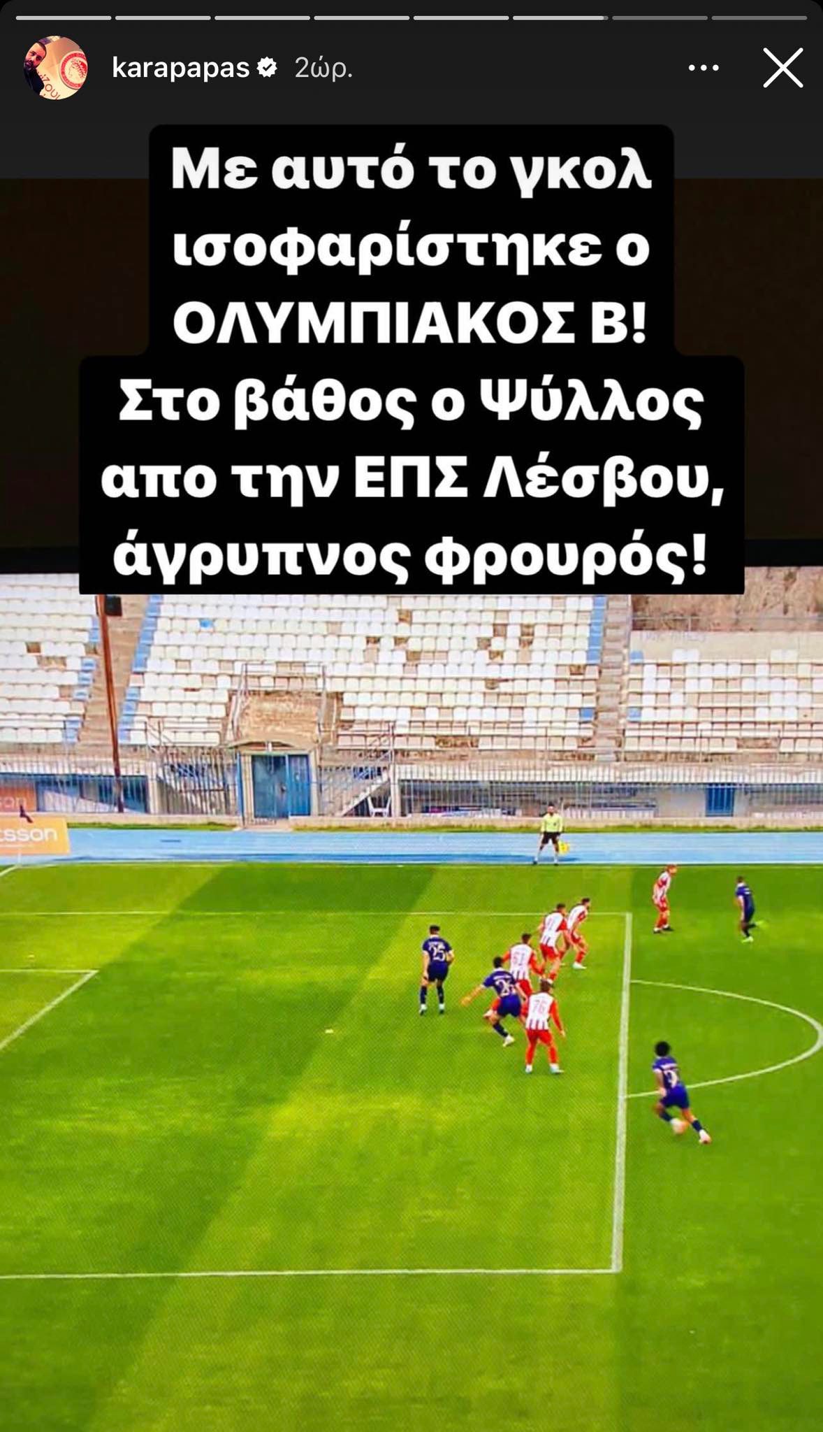 Αναλυτικά έγραψε στο Instagram: «Με αυτό το γκολ ισοφαρίστηκε ο Ολυμπιακός Β’. Στο βάθος ο Ψύλλος από την ΕΠΣ Λέσβου, άγρυπνος φρουρός!» και συνέχισε αναφορικά με το πρώτο γκολ των γηπεδούχων: «Ρε τύποι, σοβαρά τώρα, που νομίζεται ότι θα πάει αυτό;».