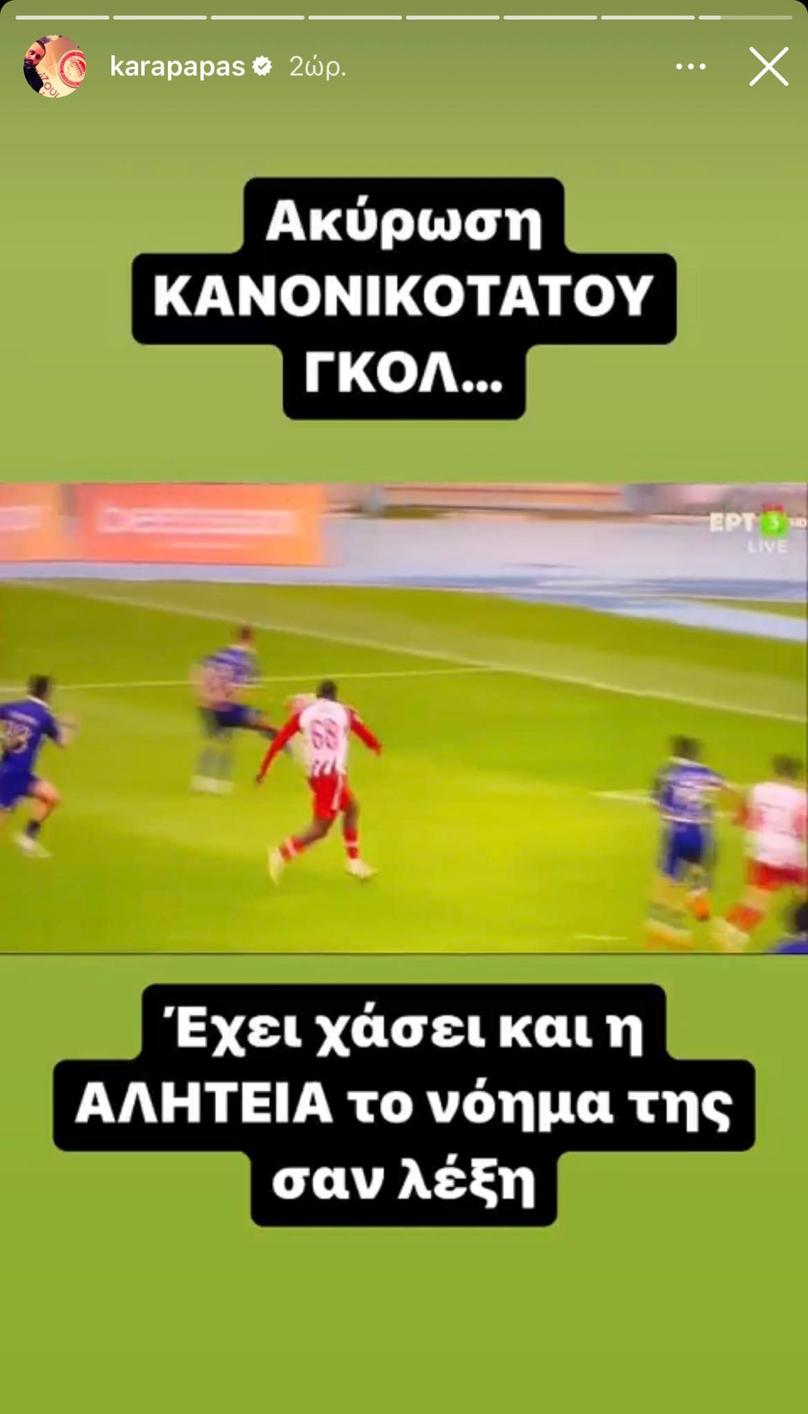 Ενώ για το γκολ που σημειώνει ο Ολυμπιακός Β’ στο φινάλε του πρώτου ημιχρόνου σχολίασε: «Ακύρωση κανονικότατου γκολ… Έχει χάσει και η ΑΛΗΤΕΙΑ το νόημά της σαν λέξη…».
