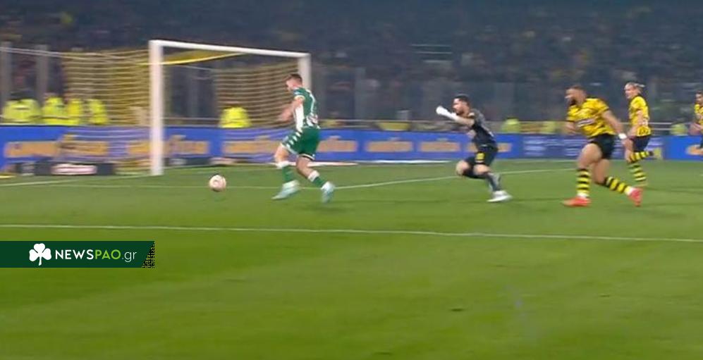 Ο Έλληνας φορ προσπέρασε τον Αθανασιάδη, πλάσαρε από δύσκολη θέση και έστειλε την μπάλα στο δοκάρι.