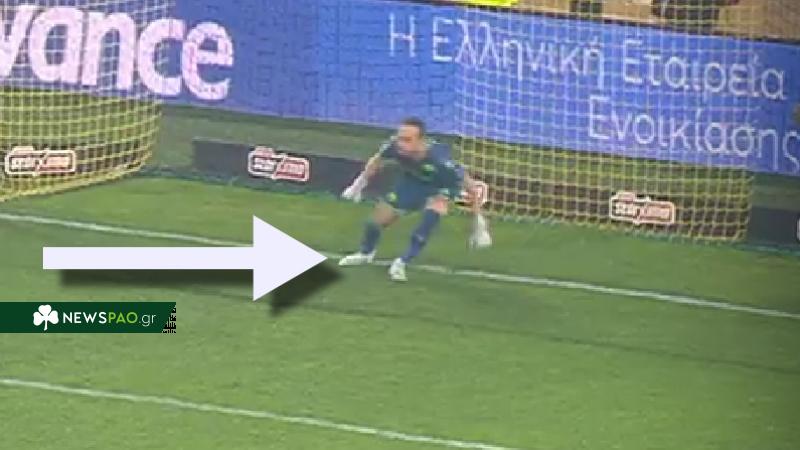 Από το ριπλέι κι αν γίνει «ζουμ» στην εικόνα παρατηρείται πως ο Ιταλός γκολκίπερ πατάει με την φτέρνα την γραμμή της εστίας του, οπότε, η απόκρουσή του είναι νόμιμη στο πέναλτι του ποδοσφαιριστή της ΑΕΚ.