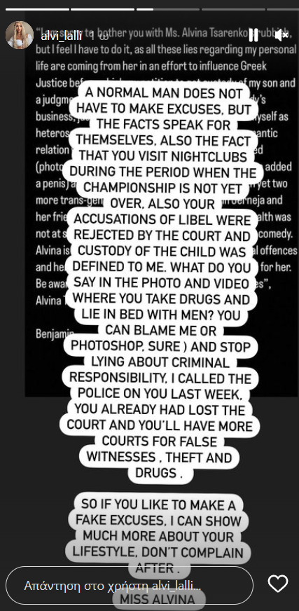 Τι λες για τα βίντεο που κάνεις καταχρήσεις και ξαπλώνει στο κρεβάτι με άντρα; Κατηγορείς εμένα και το photoshop, την περασμένη εβδομάδα κάλεσα την αστυνομία σε σένα, έχεις ήδη χάσει το δικαστήριο, μπορώ να δείξω στον κόσμο περισσότερο για τον τρόπο ζωής σου, μην με κατηγορήσεις μετά. Η Κυρία Αλβίνα.»