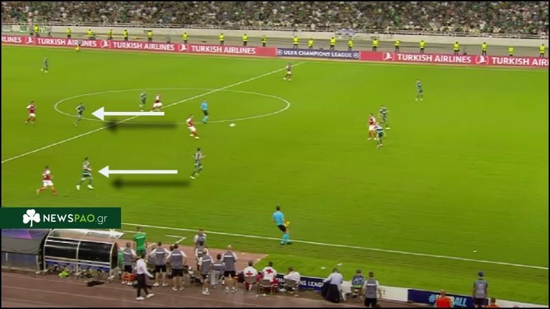 Μια ποιοτική ομάδα σαν τη Μπράγκα δεν άφησε την ευκαιρία να πάει χαμένη. Σε μια κατά μέτωπο επίθεση, προκάλεσε τη μετατόπιση του Βαγιαννίδη από τα δεξιά προς τον άξονα αφήνοντας ξεμαρκαρισμένο τον Μπρούμα. Ο νεαρός μπακ του Τριφυλλιού είχε να ανησυχεί για δύο παίκτες και κράτησε περίπου ίδιες αποστάσεις από τους δύο επιτιθέμενους της Μπράγκα.