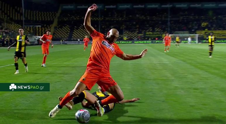 Ο Τάσος Σιδηρόπουλος επιβράβευσε με πέναλτι την ΑΕΚ για ανύπαρκτη παράβαση ποδοσφαιριστή του Άρη στον Νορντίν Άμραμπατ.