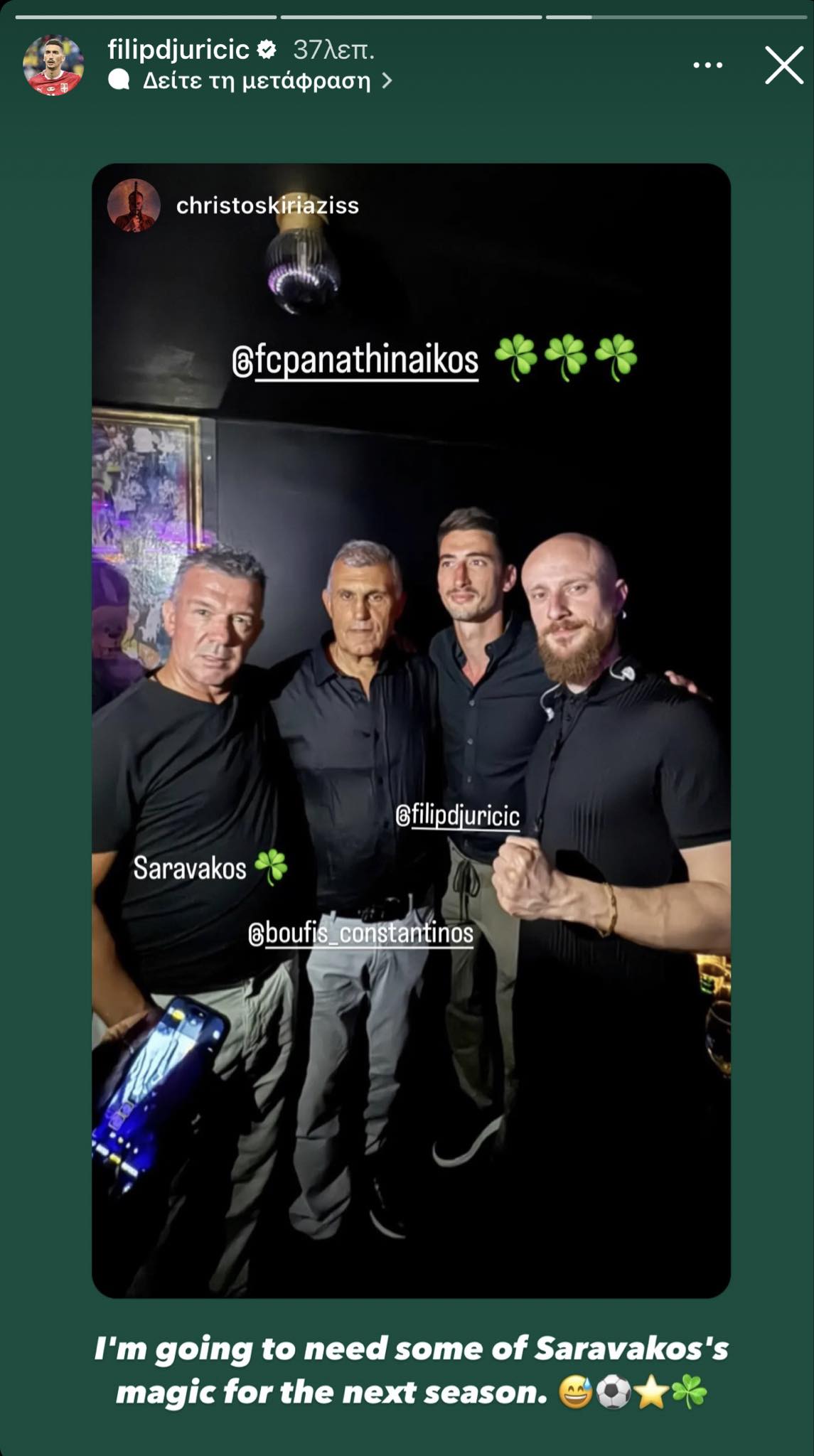 Ο πρώην ποδοσφαιριστής της Σαμπντόρια συναντήθηκε με τον Δημήτρη Σαραβάκο και κοινοποίησε ένα «στόρι» στο Instagram με τον θρύλο του συλλόγου.