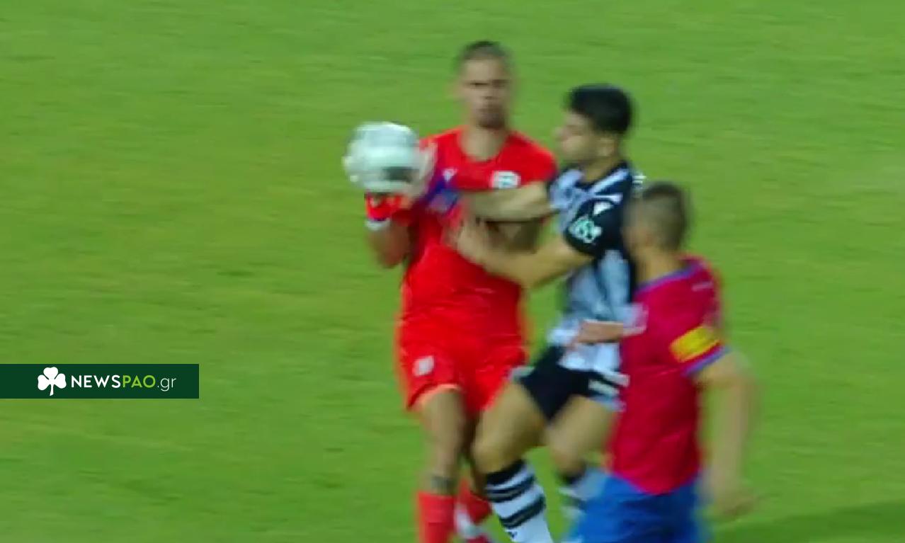 Ο στόπερ του ΠΑΟΚ έπεσε πάνω στον Κοτάρσκι, πήρε τη μπάλα με το χέρι από τον τερματοφύλακά του και ο Δικέφαλος τιμωρήθηκε με πέναλτι.