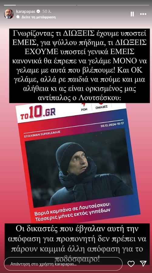 Ο Κώστας Καραπαπάς τάχθηκε υπέρ του ΠΑΟΚ και του Ραζβάν Λουτσέσκου σε ανάρτησή του στο Instagram.