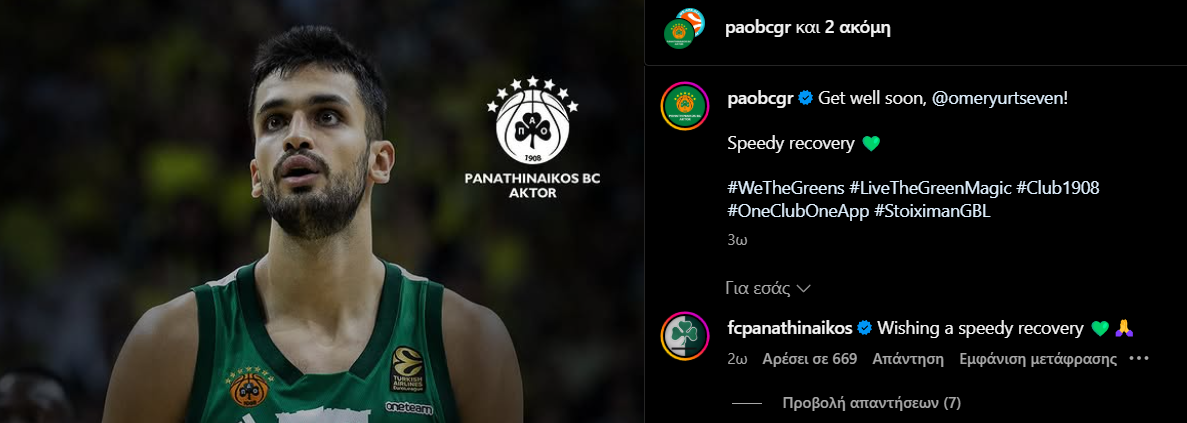 Η ΠΑΕ Παναθηναϊκός έστειλε τις δικές της ευχές για ταχεία ανάρρωση στον Ομέρ Γιουρτσεβέν μέσω της ανάρτησης της «πράσινης» ΚΑΕ.